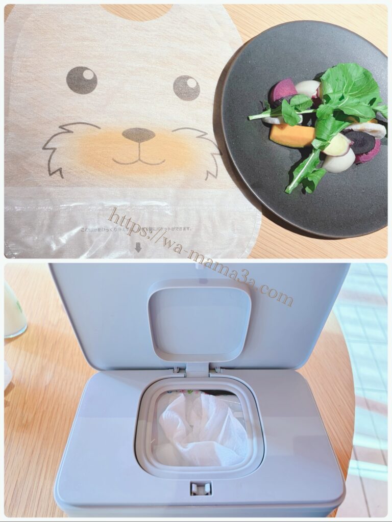 席に着くと、子ども用食事エプロン、お手拭きウェットティッシュが置かれていました!