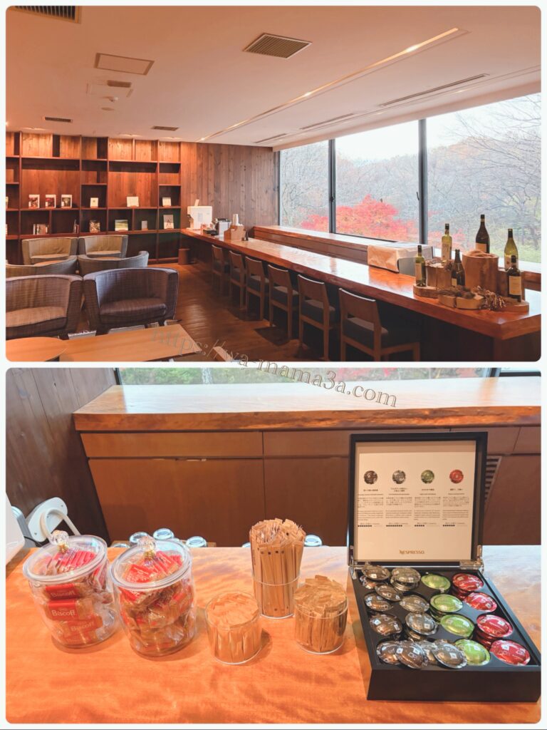 - コーヒー飲み放題、夜はお酒も飲めるラウンジに近い