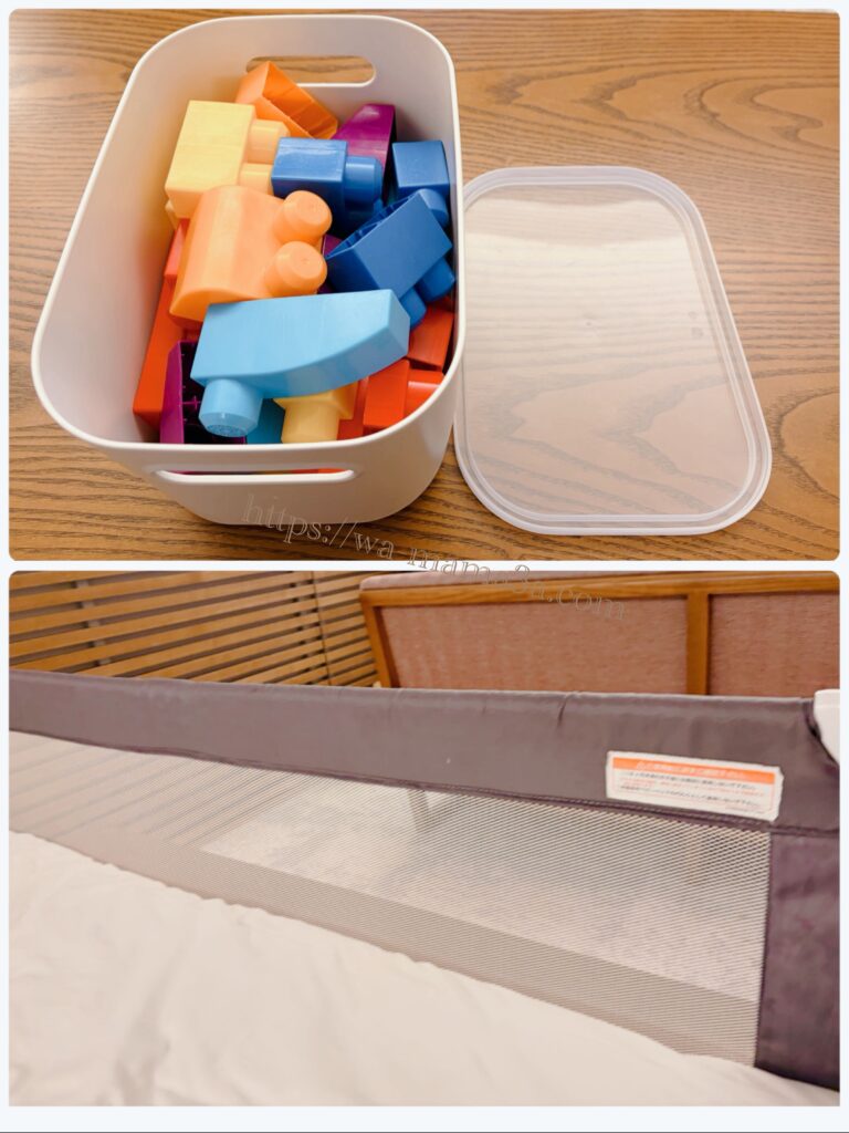 写真は、子ども用のおもちゃ(ブロック)、ベッドガードです。とても助かりました!